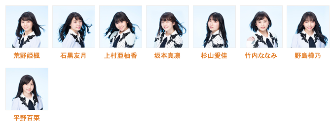 荒野姫楓・石黒友月・上村亜柚香・坂本真凛・杉山愛佳・竹内ななみ・野島樺乃・平野百菜※都築里佳から平野百菜へメンバーが変更となっております。12月2日時点