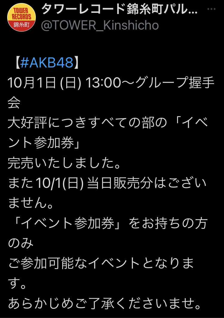 【朗報】 9/30(土)10/1 (日)AKB48 グループ握手会 渋谷も完売wwwwwwwww 【池袋・錦糸町・渋谷…全完売のお知らせ】