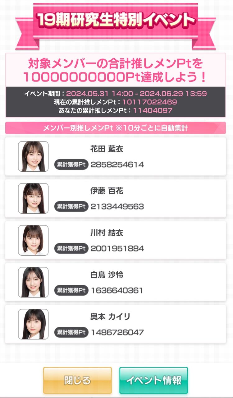 19期研究生の5人の推しメンPtの合計値が100億Ptを達成しました🎊