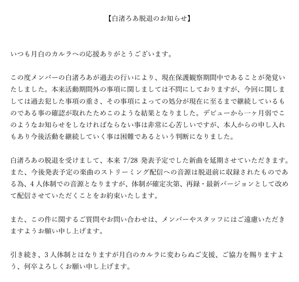 【白渚ろあ 脱退のお知らせ】