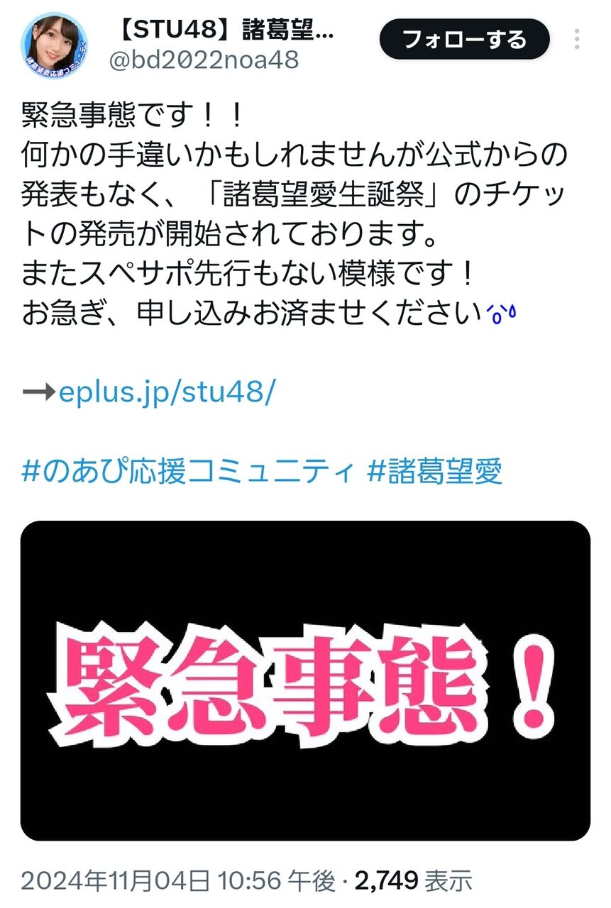 【悲報】諸葛ちゃん生誕祭のチケット、何の告知もなく受付が始まりすでに受付終了