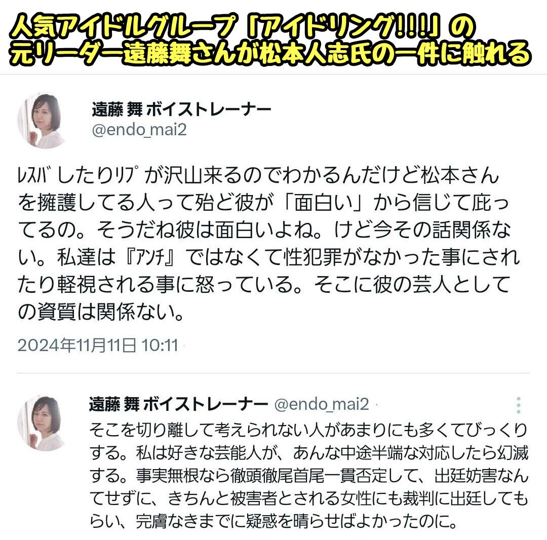 アイドリング遠藤舞が松本人志の性加害告発!松本の復帰が白紙へwwwwwwwwww