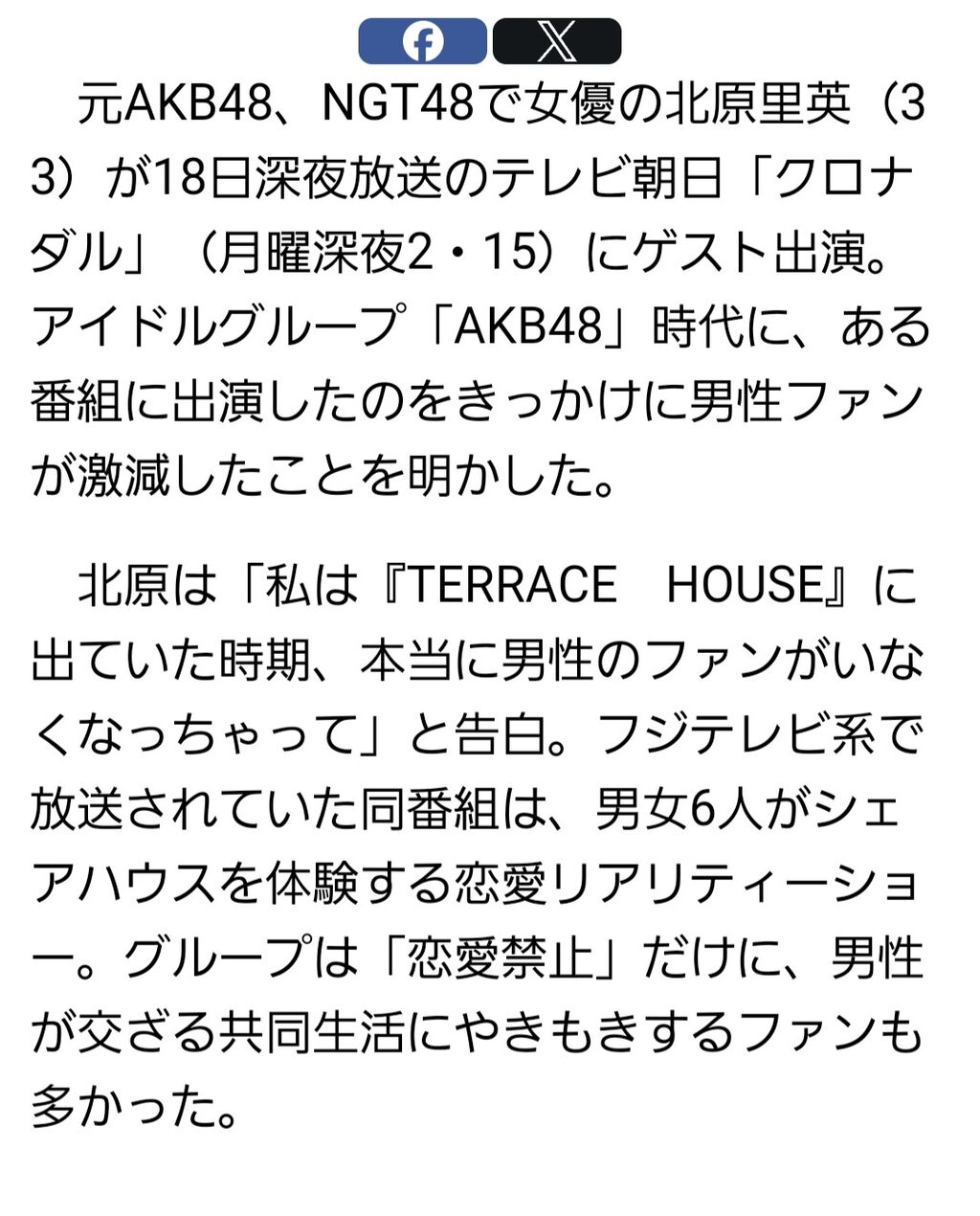 北原里英「テラスハウスに出演して男性ファンがいなくなった」