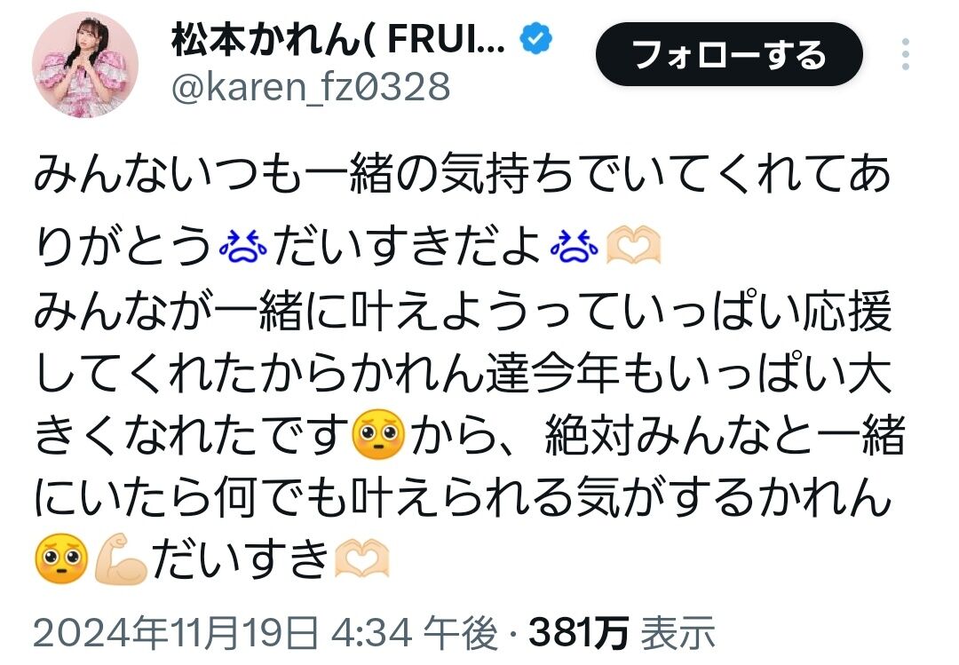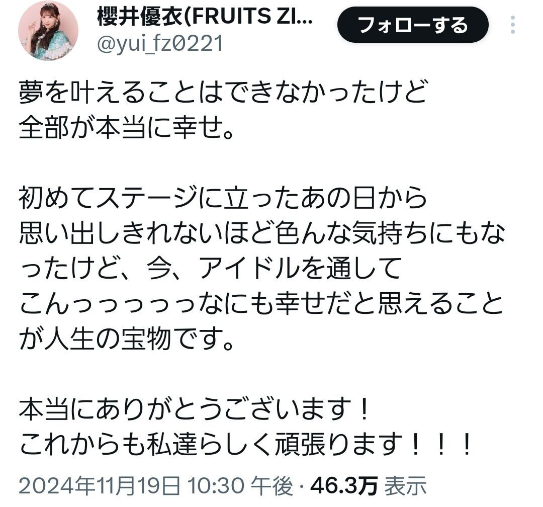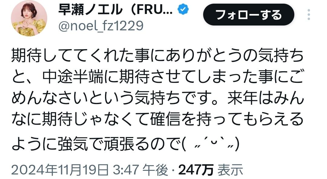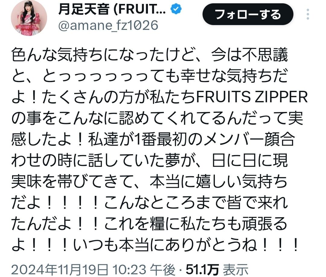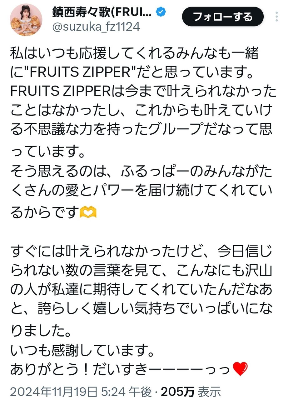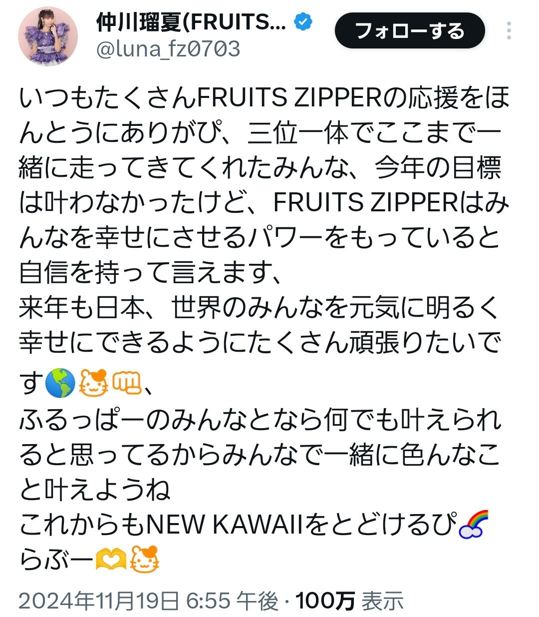 FRUITS ZIPPERさん紅白落選のお気持ち表明