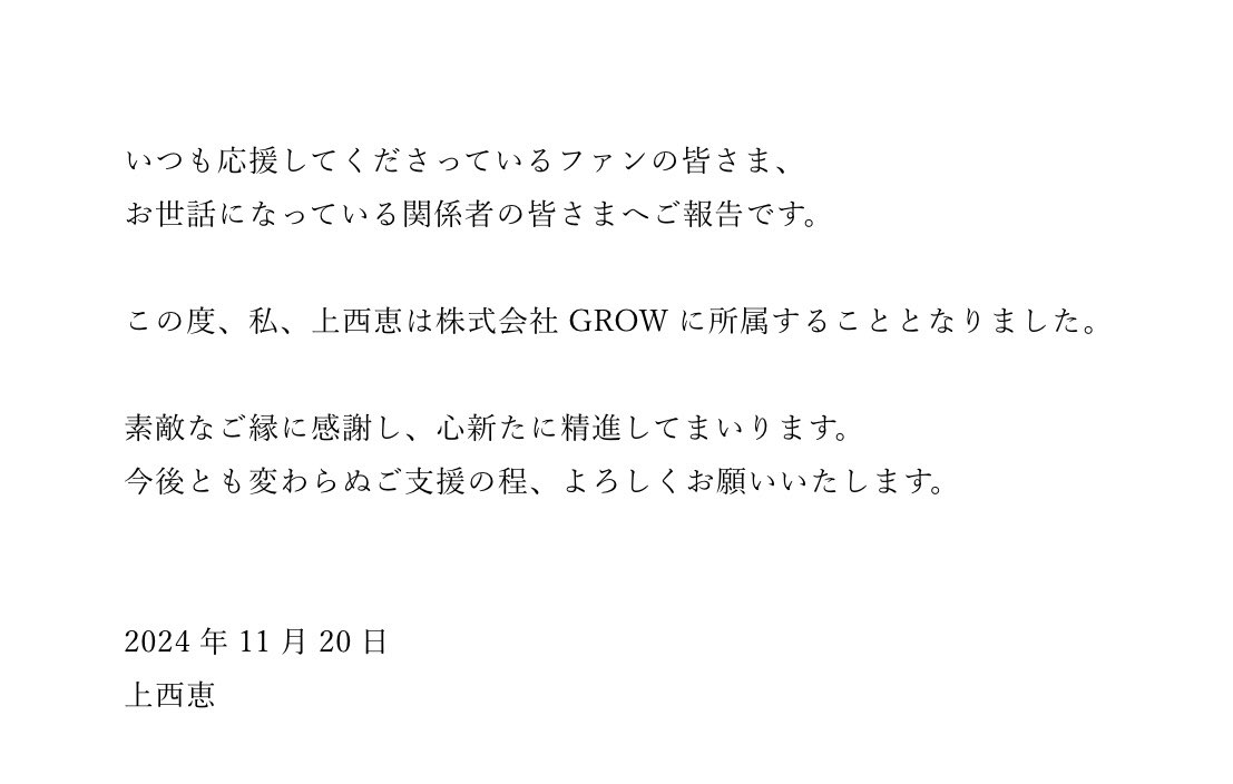 元NMB48上西恵さん、芸能事務所GROWに移籍!