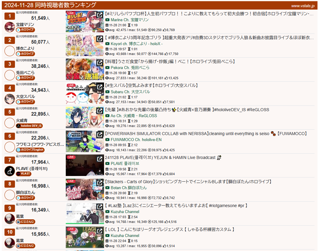 11/28同接ランキング