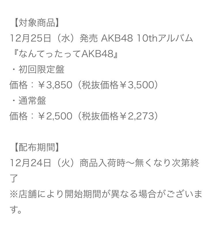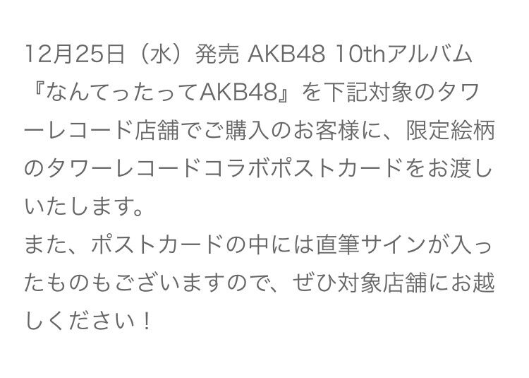 【本日 12/24(火) 】AKB48、10thアルバム『なんてったってAKB48』フラゲ日・全国タワレコ限定 メンバー直筆サイン入りポスカ ランダム封入