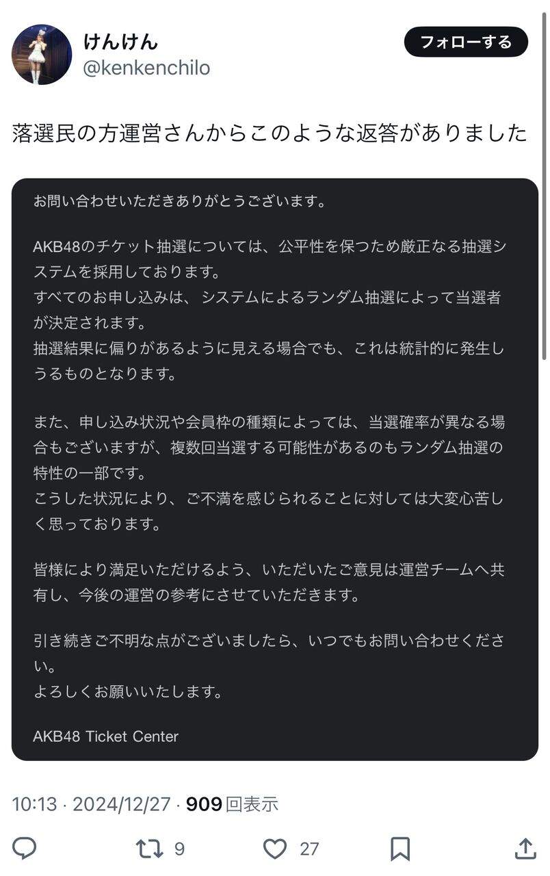 AKB運営「公演の抽選システムは厳正だ!当選が偏るのはランダム抽選の特性だ!」