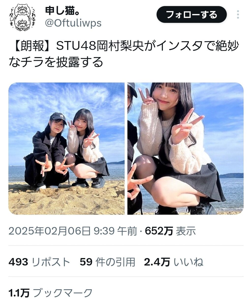 【速報】岡村梨央ちゃんのパ○チラが2万バズwwwwwwwwww