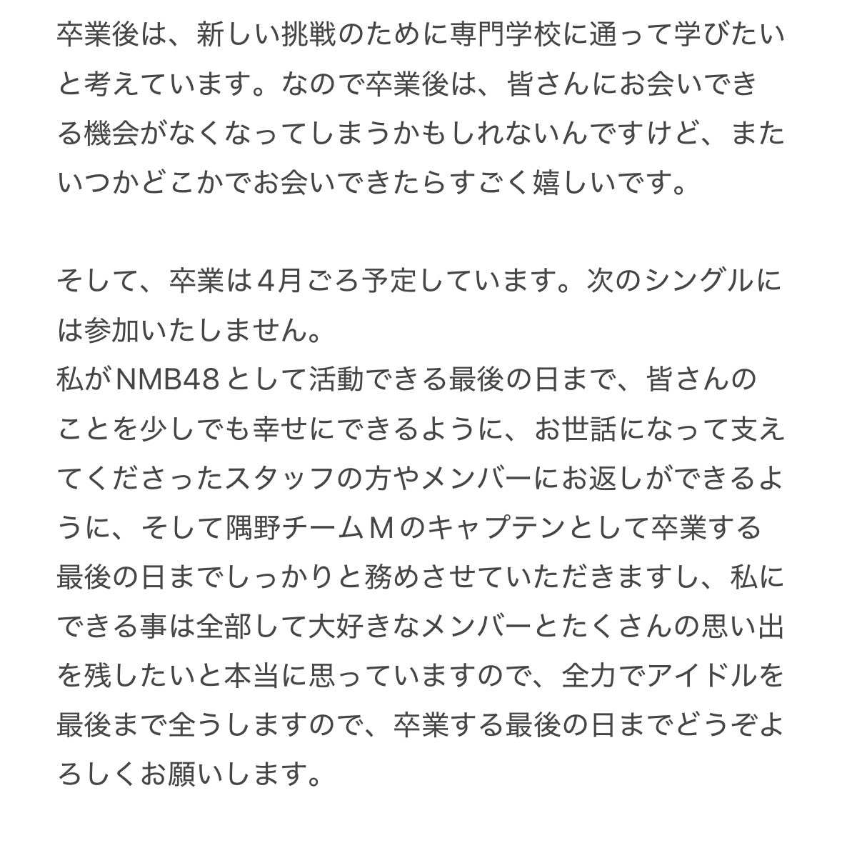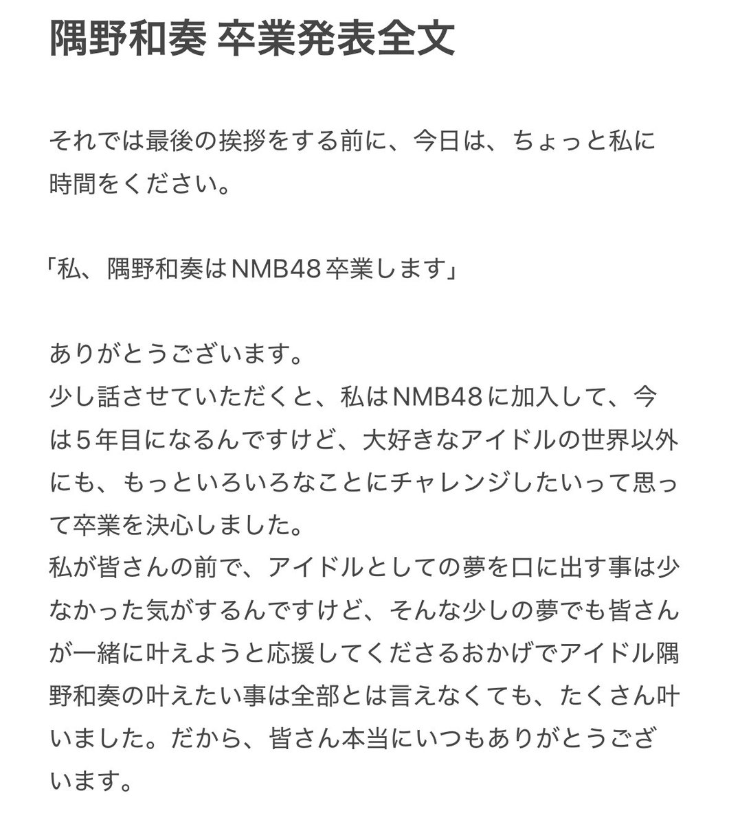 NMB48隅野和奏が卒業発表!