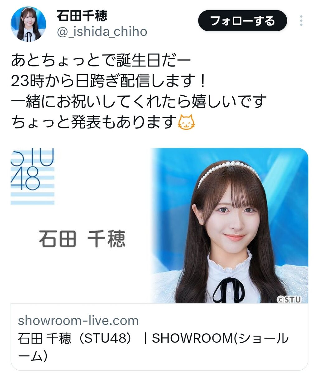 【速報】STU石田千穂さんから23時からの配信で発表あり