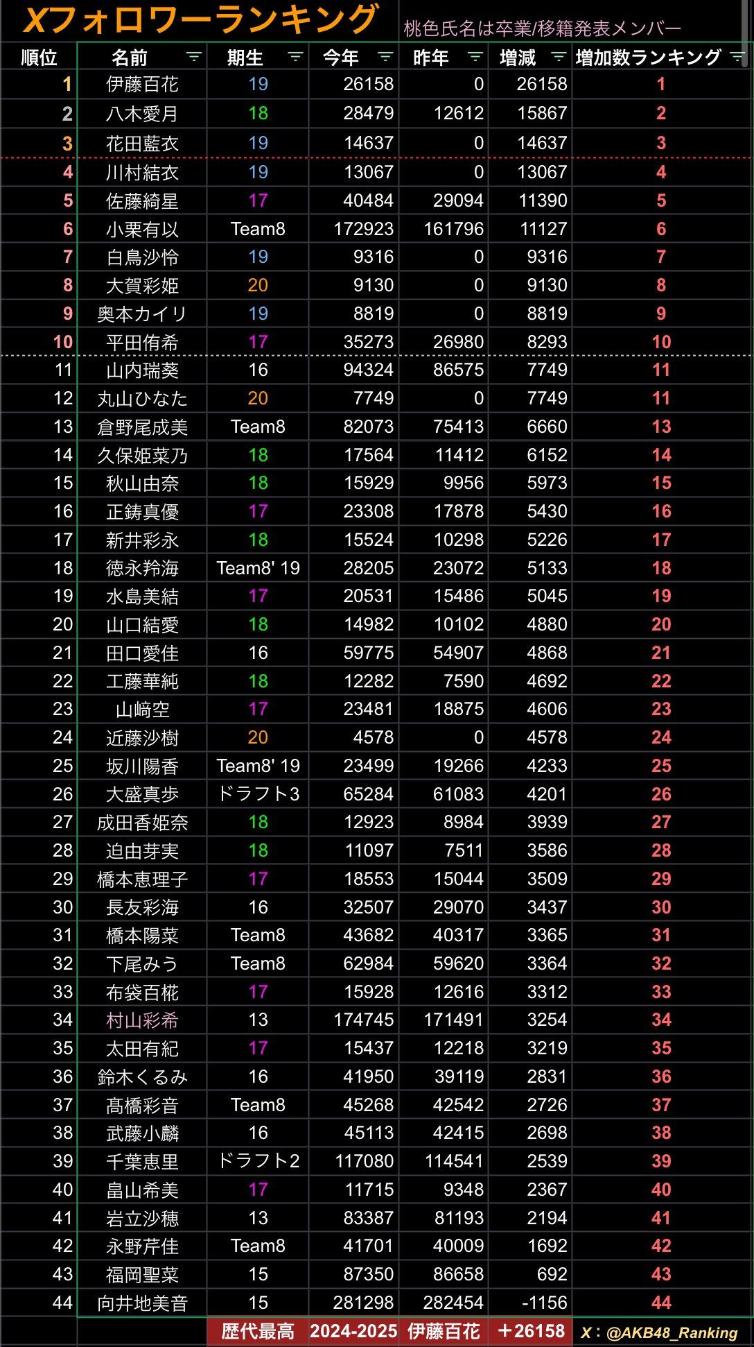 【速報】AKB48 年間フォロワー増加数ランキング 1位 伊藤百花 2位 八木愛月 3位 花田藍衣 4位 川村結衣 5位 佐藤綺星【2024→2025】
