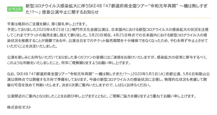 SKE48 | ニュース | 新型コロナウイルス感染拡大に伴うSKE48 「47都道府県全国ツアー”令和元年再開” 〜機は熟しすぎた!?〜」 徳島公演中止に関するお知らせ