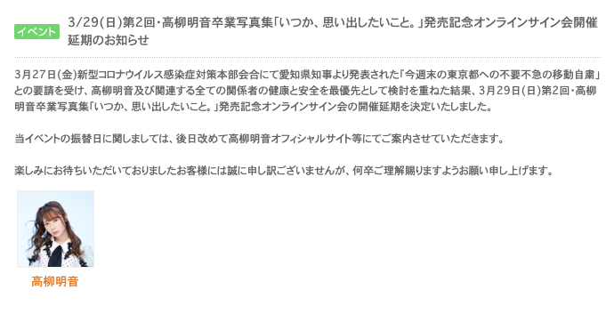 3月27日(金)新型コロナウイルス感染症対策本部会合にて愛知県知事より発表された「今週末の東京都への不要不急の移動自粛」との要請を受け、高柳明音及び関連する全ての関係者の健康と安全を最優先として検討を重ねた結果、3月29日(日)第2回・高柳明音卒業写真集「いつか、思い出したいこと。」発売記念オンラインサイン会の開催延期を決定いたしました。当イベントの振替日に関しましては、後日改めて高柳明音オフィシャルサイト等にてご案内させていただきます。