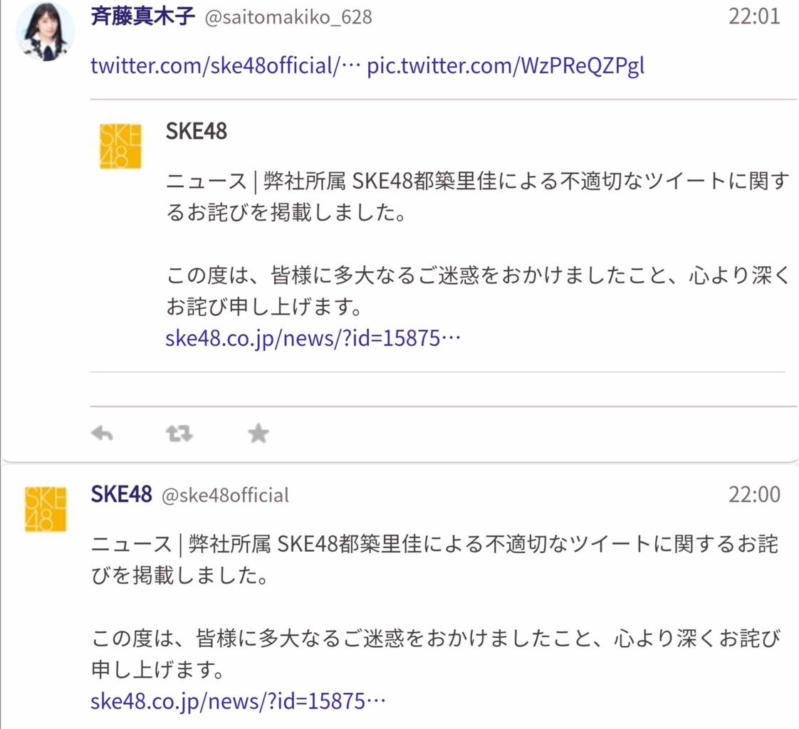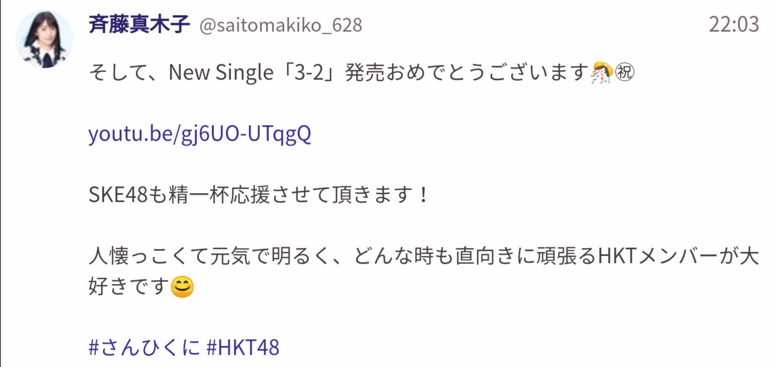 斉藤真木子「New Single『3-2』発売おめでとうございます。SKE48も精一杯応援させて頂きます!HKTメンバーが大好きです」www