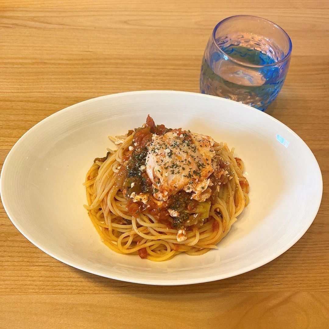 #おうち時間を楽しもう #パスタランチ #自炊 #トマトパスタ #温玉のせ #チーズ #パセリ もわすれずに