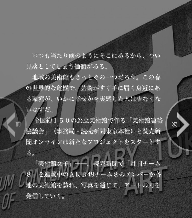 本企画は、「読売新聞で『月刊チーム8』を連載中のAKB48 チーム8のメンバーが各地の美術館を訪れ、写真を通じて、アートの力を発信していく」(公式サイトより)というもの。