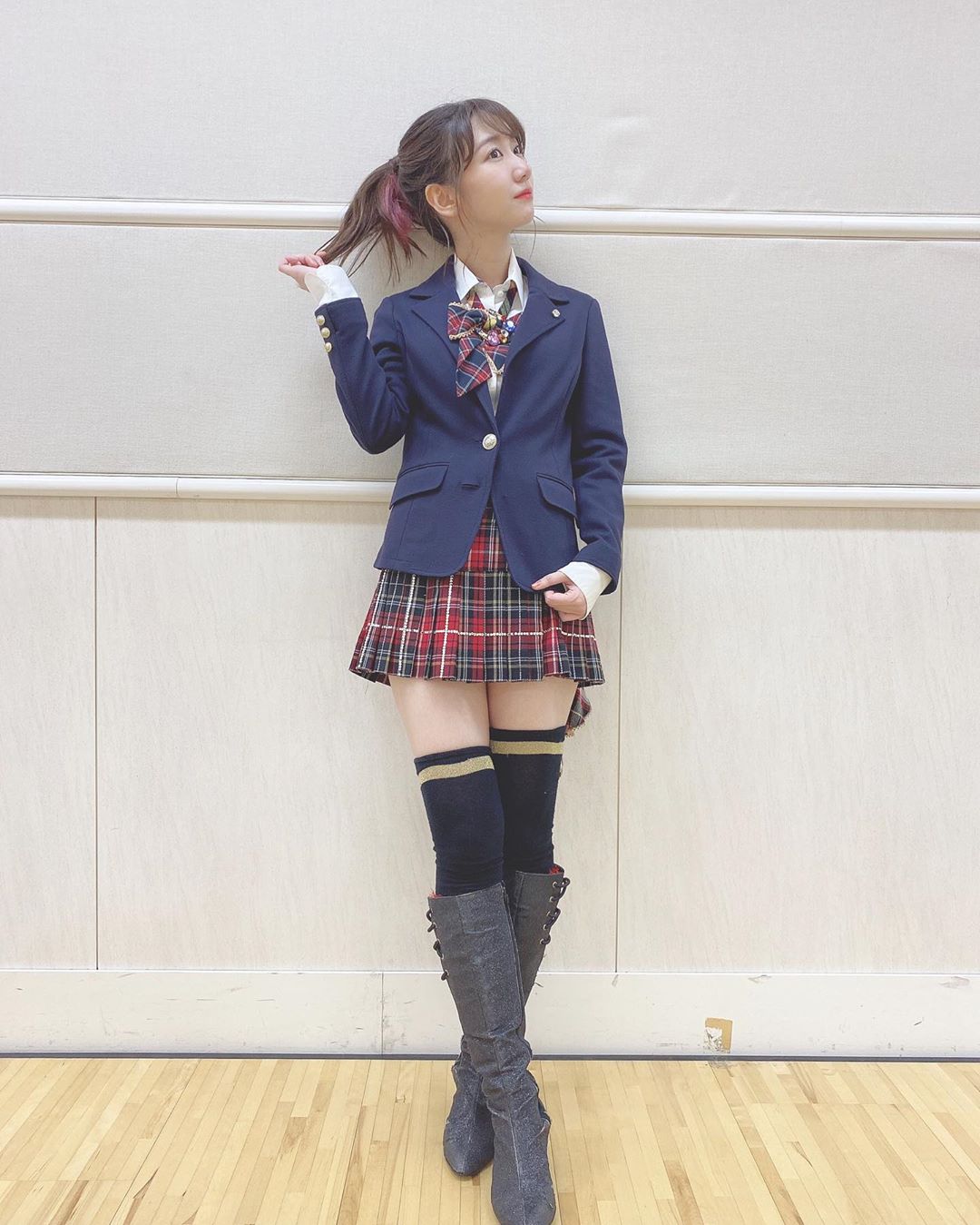 17日に柏木は「前田さんの衣装を貸していたた゛きました」と、動画撮影のときに撮影したと思しきチェック柄のミニスカートに紺色のブレザー