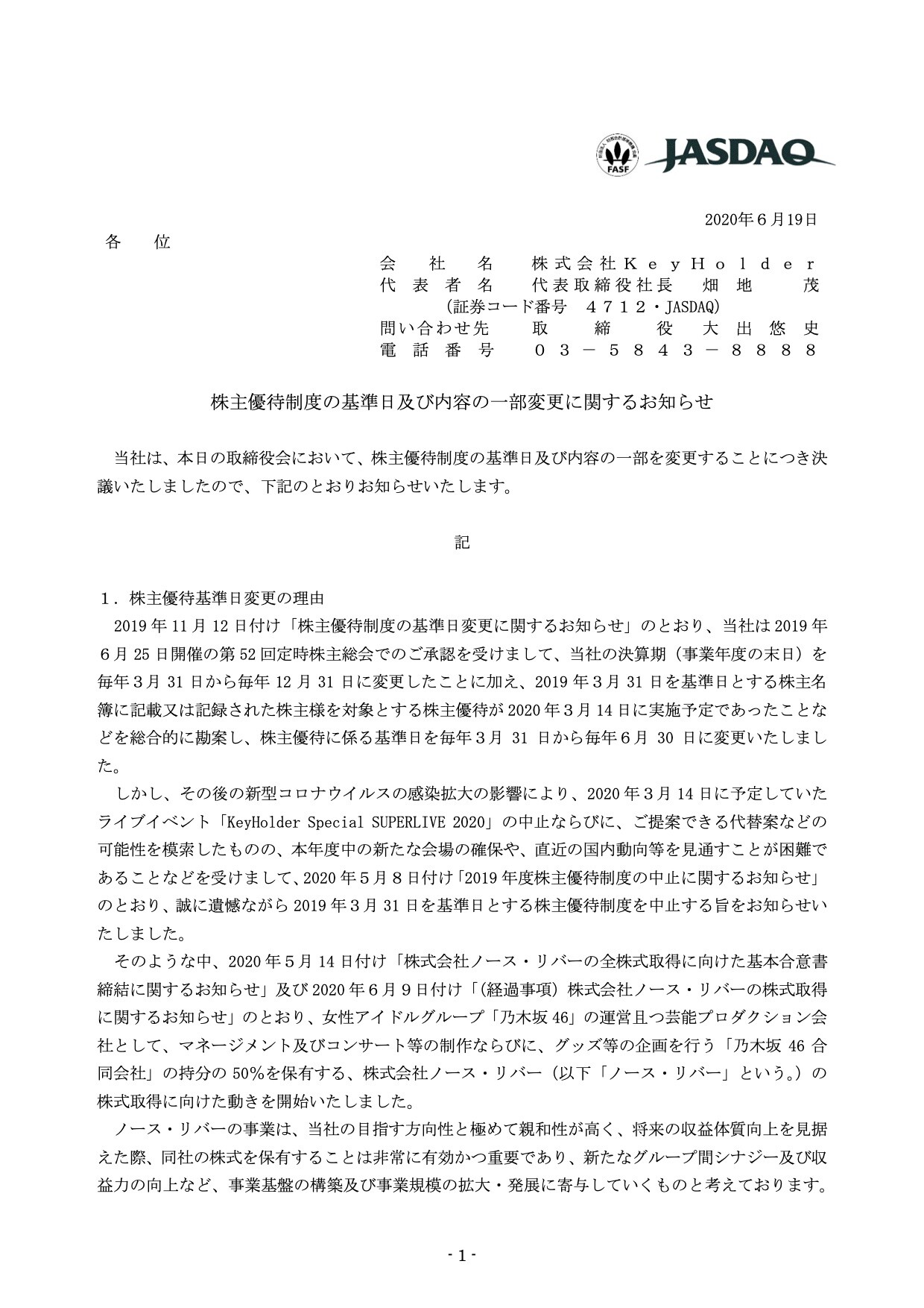 変更後:「株主限定ファンコミュニティ(仮)」 ※現時点において「株主限定ファンコミュニティ(仮)」とは、例えば、KeyHolder グループに 所属或いは関係するアイドルグループやアーティスト、タレント等に係るライブやイベント、配 信や催しなどのチケット及びグッズ等の優先申込みや優先購入、オンラインチャット、フォトセ ッションの参加など、既存のファンクラブとは異なるコンテンツやサービスなどを想定しており ます。