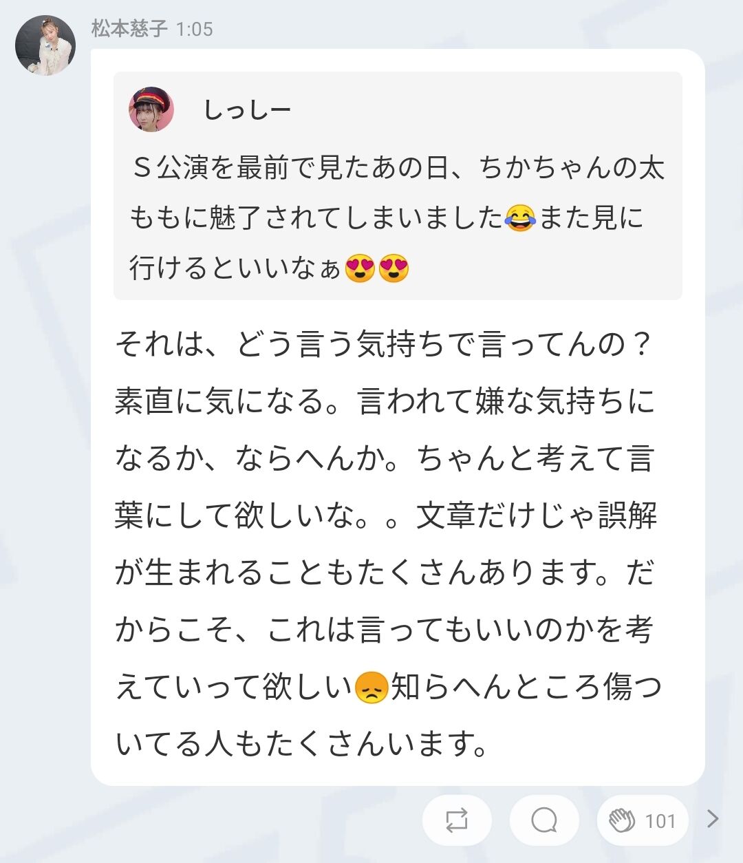 味噌オタ「最前で太ももに魅了されました」 メンバー「言われて嫌な気持ちになるか考えて発言しろハゲ!傷ついている人たくさんいる」