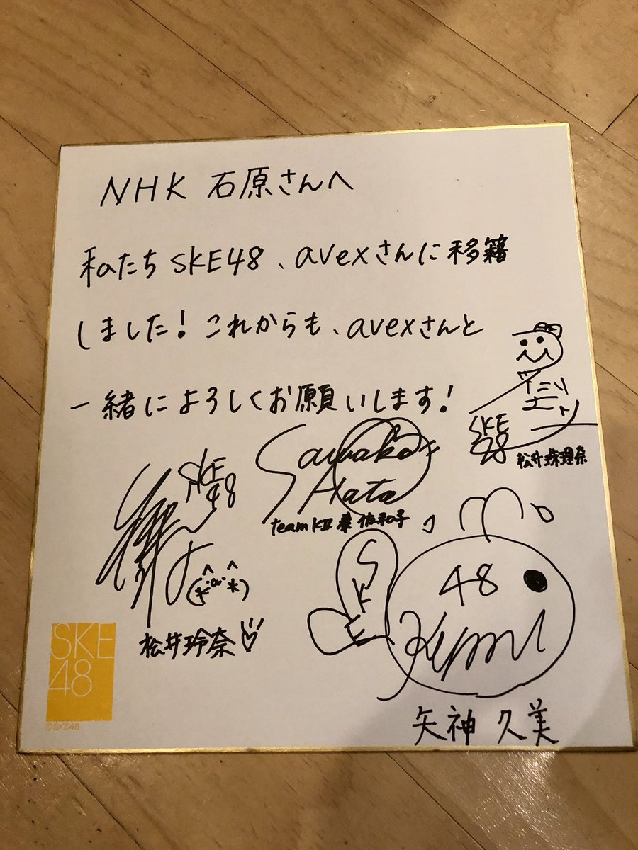 SKE48avex移籍の色紙「珠理奈さん玲奈さん矢神さんに秦さん」
