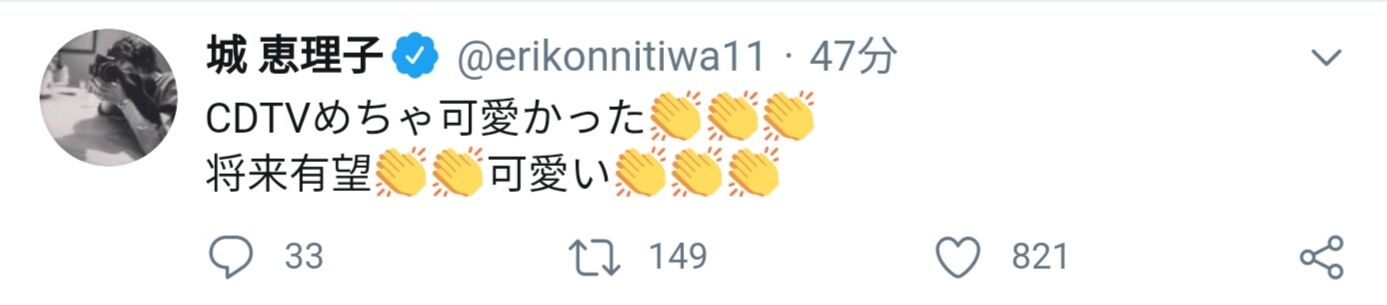 城恵理子「CDTVめちゃ可愛かった 将来有望 可愛い」