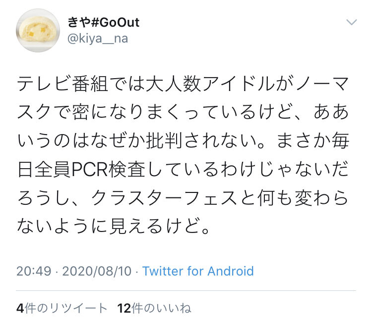 有識者「大人数アイドルがノーマスクで密になるテレビ番組はなぜか批判されない。クラスターフェスと何も変わらないのに」