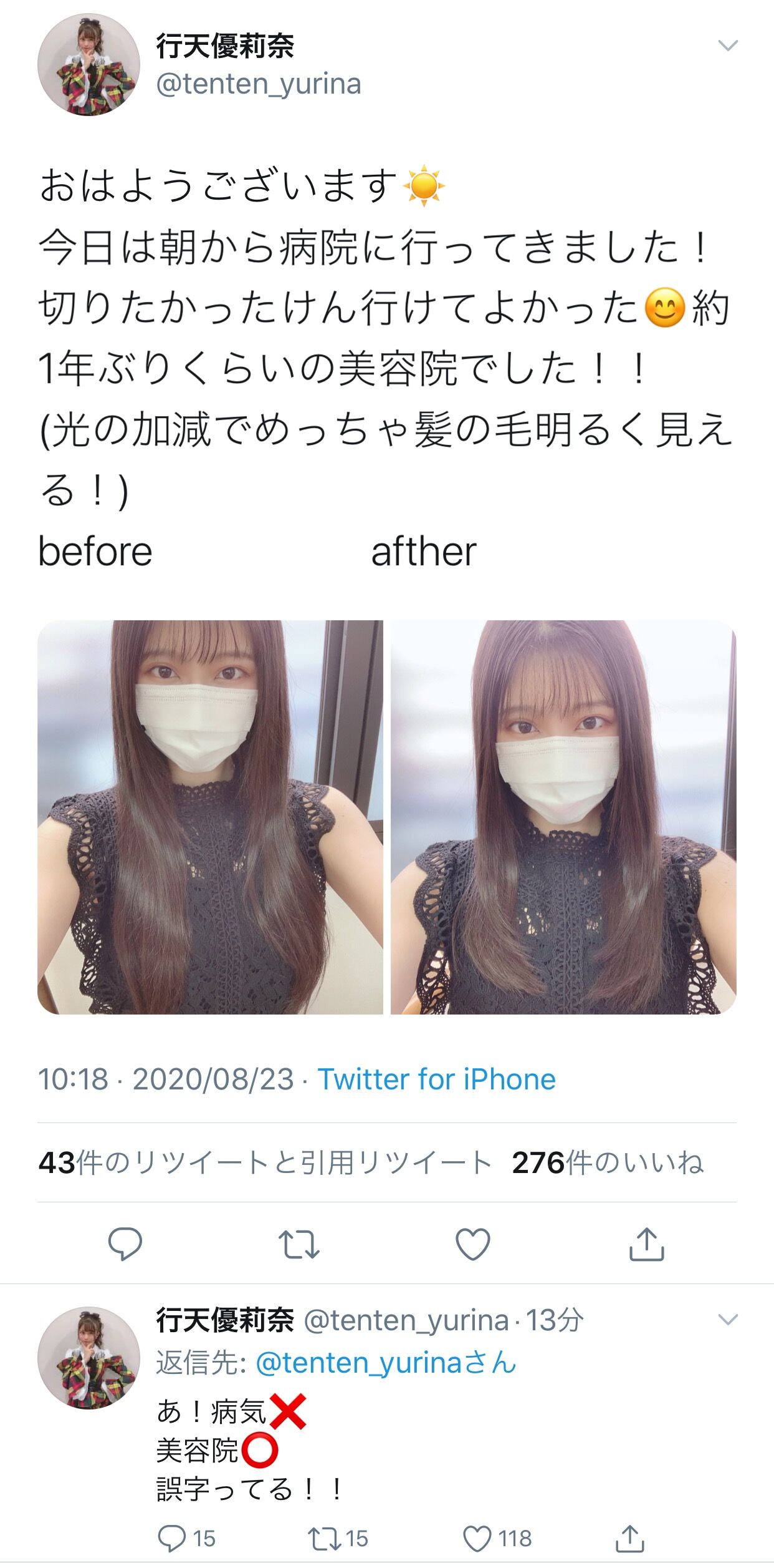 行天優莉奈さん「今日は朝から病院に行ってきました」